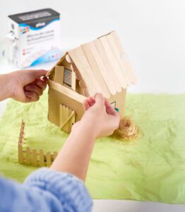 Etapa de 6 a 12 años: Materiales más estructurados y técnicos como pinzas, pinceles de punta fina, pistola de silicona fría, cartón pluma, palos de madera, lanas y cordeles de colores, alambre de aluminio, regla métrica, escuadra, lápiz de grafito.