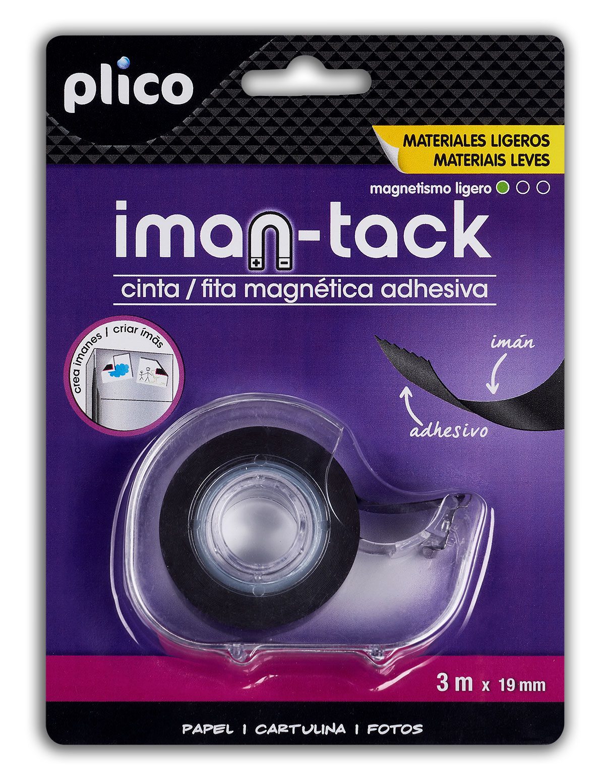Fita de dupla face, magnética de um lado e adesiva do outro. Com o distribuidor, consegue exibir fotos ou desenhos num piscar de olhos.